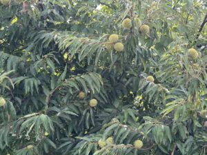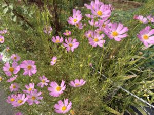 道端のコスモス、青い柿、たわわに実った栗を見ることができます。