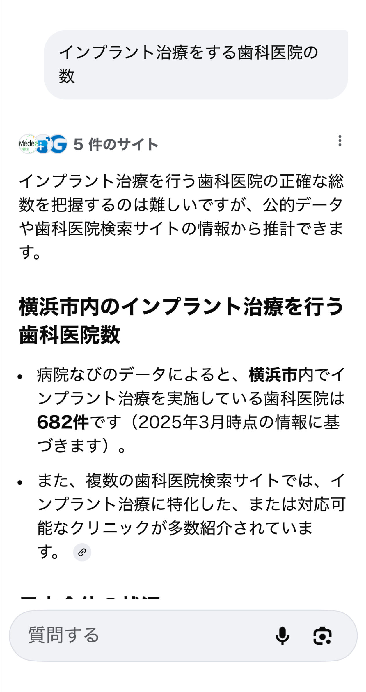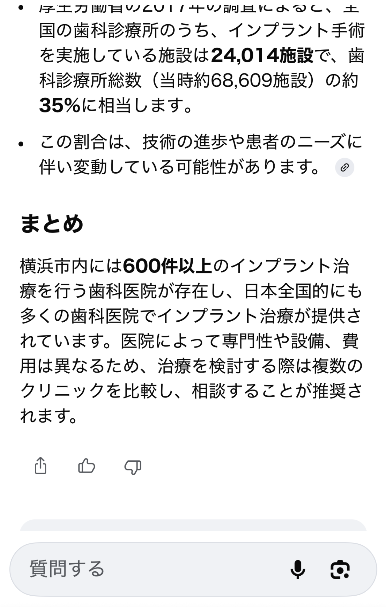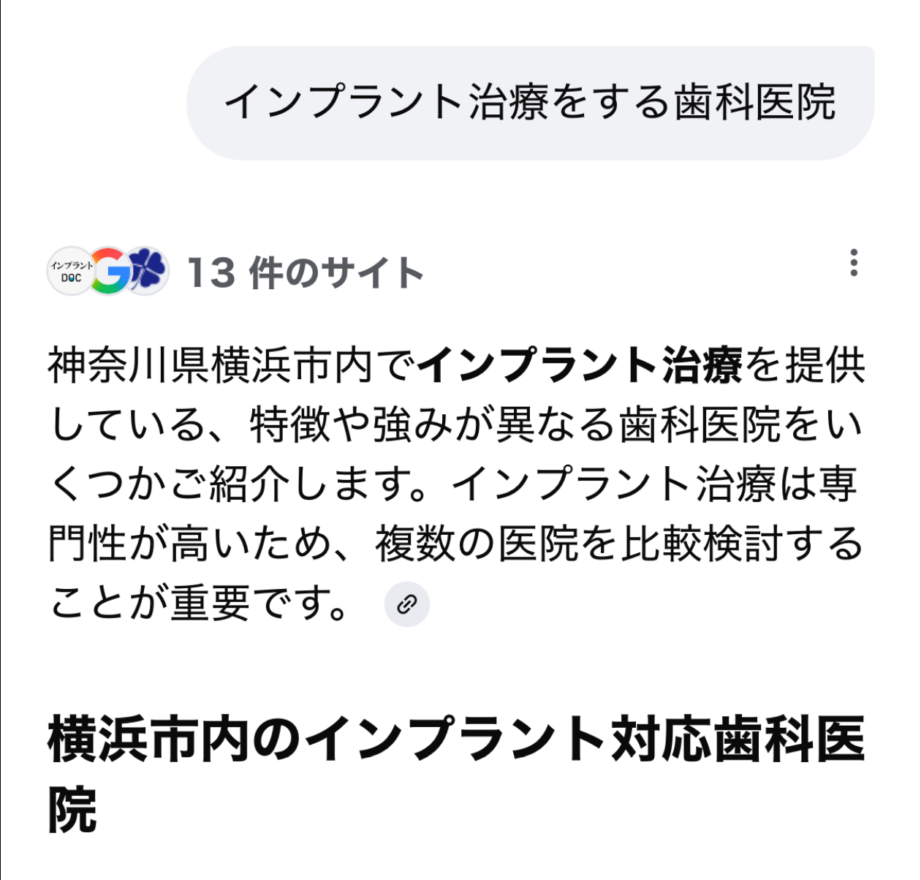 例えばインプラント治療をする歯科医院の数を聞くと自分の居場所に近い所が表示されます。
